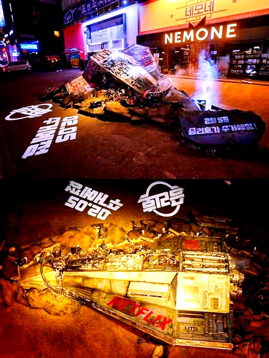 앞서 지난 11일 온라인 커뮤니티와 SNS를 중심으로 '서울 강남역 인근에 추락한 우주선' 사진이 올라와 사람들의 관심을 끌었습니다. 설치된 우주선에는 넷플릭스 로고와 함께 '2월 5일 승리호가 수거 예정'이라는 문구가 적혀 있었다고 하는데요.