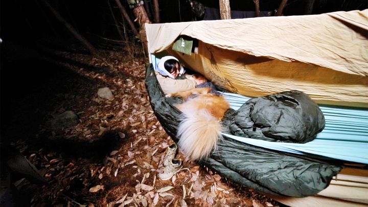 야생 캠핑은 칼, 톱날 같은 최소한의 공구를 가지고 자연에서 얻은 재료를 이용해 생존하는 캠핑이다. 농구공만 한 크기의 해먹 역시 최소한의 짐으로 흔적을 남기지 않고 머무를 수 있는 잠자리인데...